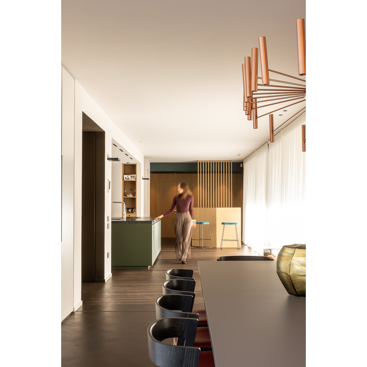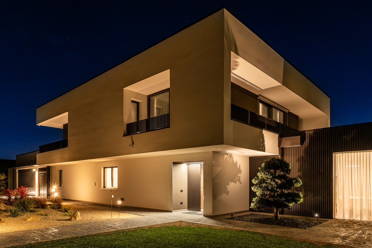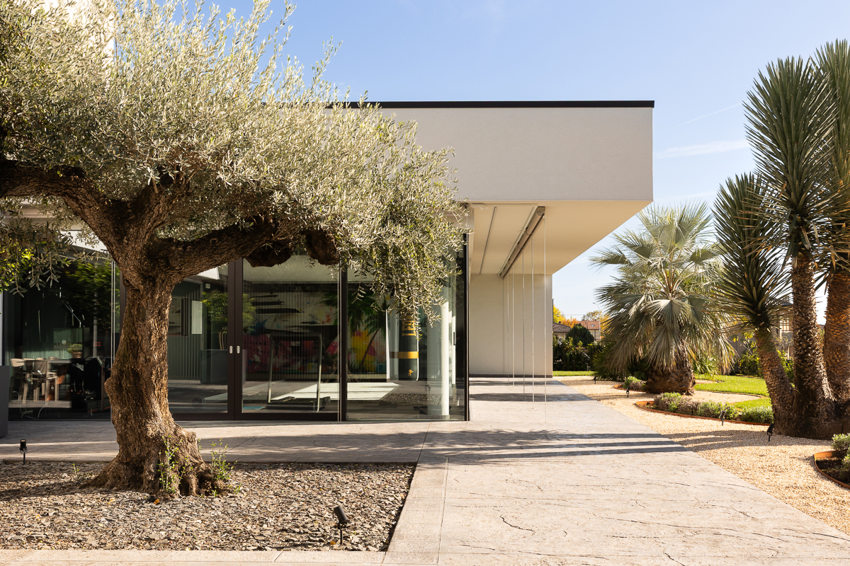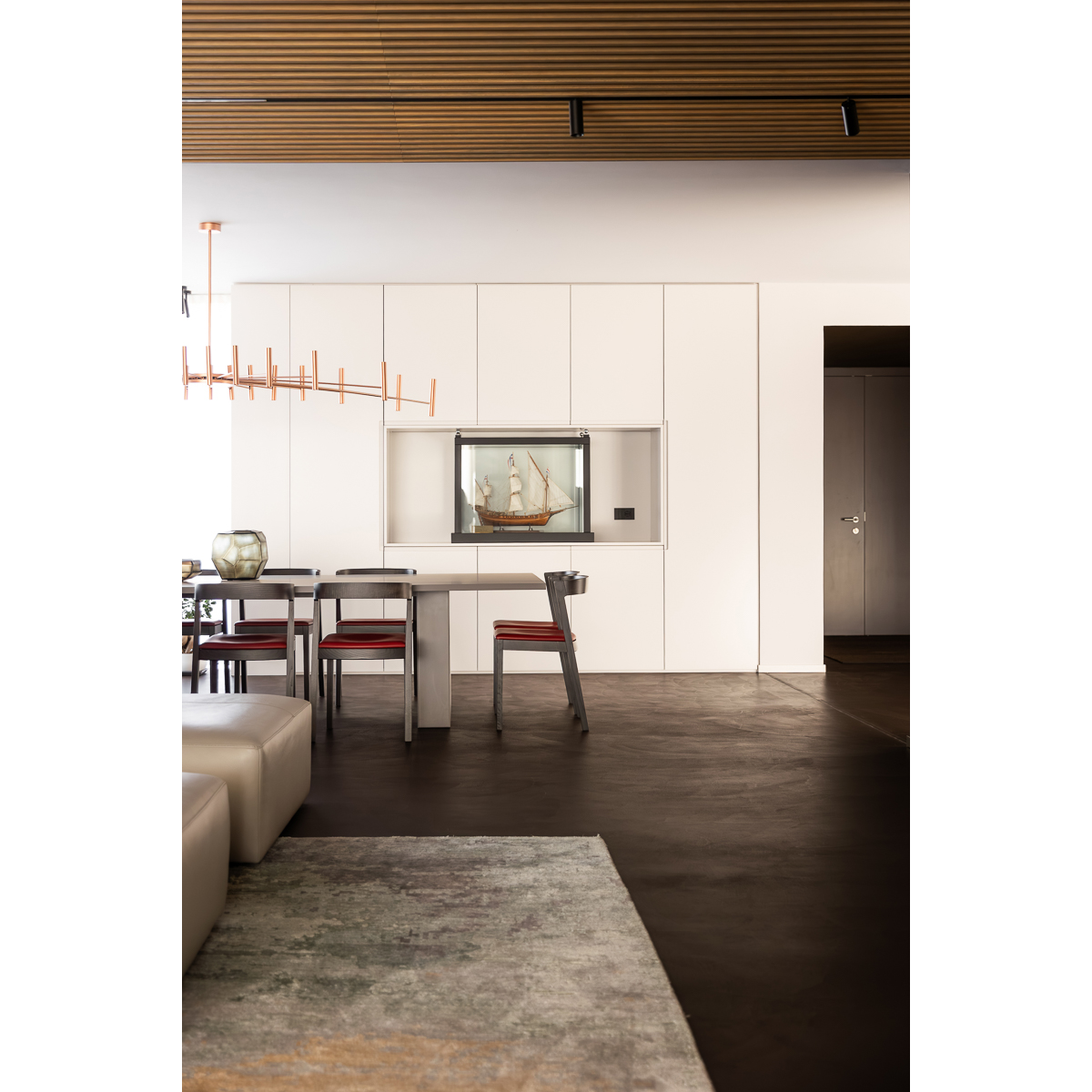 Un progetto che nasce dalla collaborazione con lo studio dell’ing. Cristian Lievore per la direzione artistica mirata all’aspetto esterno dei volumi architettonici e che si sviluppa poi in un percorso completo di interior design, dove ogni dettaglio è stato pensato per creare una casa contemporanea dal carattere mediterraneo in un dialogo profondo tra spazio e vissuto. L’architettura esterna si staglia contro il cielo con linee pure e superfici candide che catturano la luce, trasformandola in un gioco continuo di ombre e riflessi. All’interno, gli spazi si aprono in una sequenza fluida dove il legno caldo abbraccia le pareti, il rame delle luci disegna geometrie aeree e i pavimenti raccontano la terra.