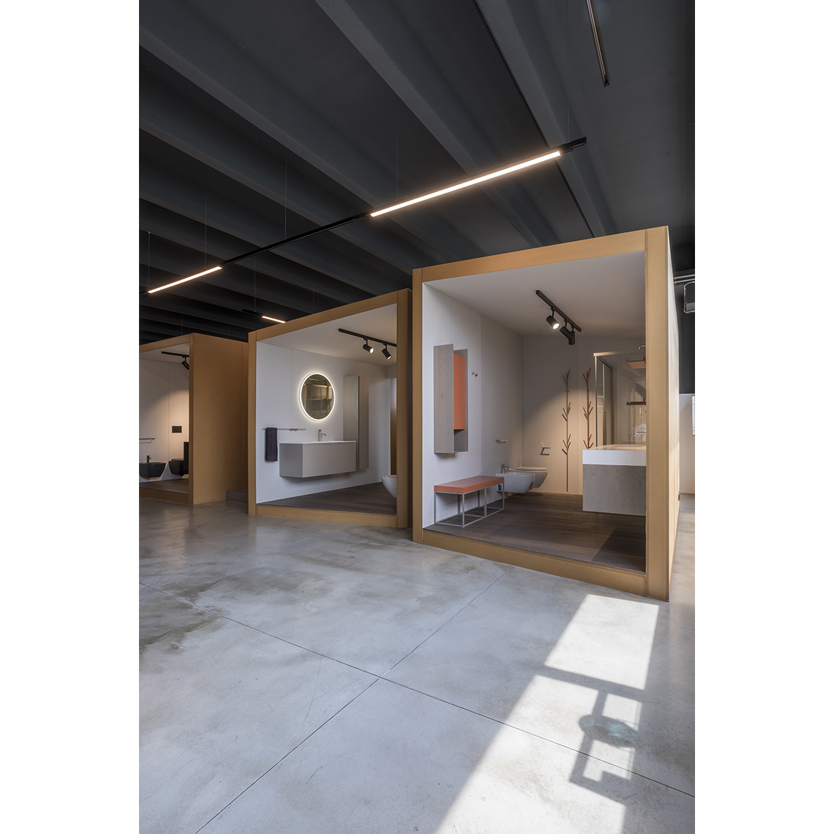 Ci troviamo all’interno di un edificio industriale che si estende per circa 650 mq. divenuto nuova sede espositiva di questa azienda riconosciuta sul territorio come punto di riferimento per l’arredo bagno. Il grande openspace è caratterizzato dalla presenza di alcuni contenitori dalle forme inaspettate, ogni uno dei quali è dedicato all’esposizione di un “ambiente bagno“ completo in ogni minimo dettaglio. Tutti i volumi, realizzati con pannellature in MDF, sono stati lasciati volutamente grezzi al loro esterno, mentre all’interno sono rifiniti con pitture murali e pavimenti in legno per ricreare concretamente delle situazioni abitative; le pedane invece sono rivestite in resina, pensate per collocare su piani diversi il concetto di esposizione. La luce naturale entra dalle ampie vetrate dove un lungo frangi-luce verticale accompagna il visitatore attraverso il percorso espositivo, scandendo il passare del tempo e creando accattivanti giochi di luci e ombre. Infine lo studio minuzioso dell’impianto di illuminazione garantisce il miglior comfort visivo globale e permette al contempo l’attenta osservazione di ogni singolo prodotto.