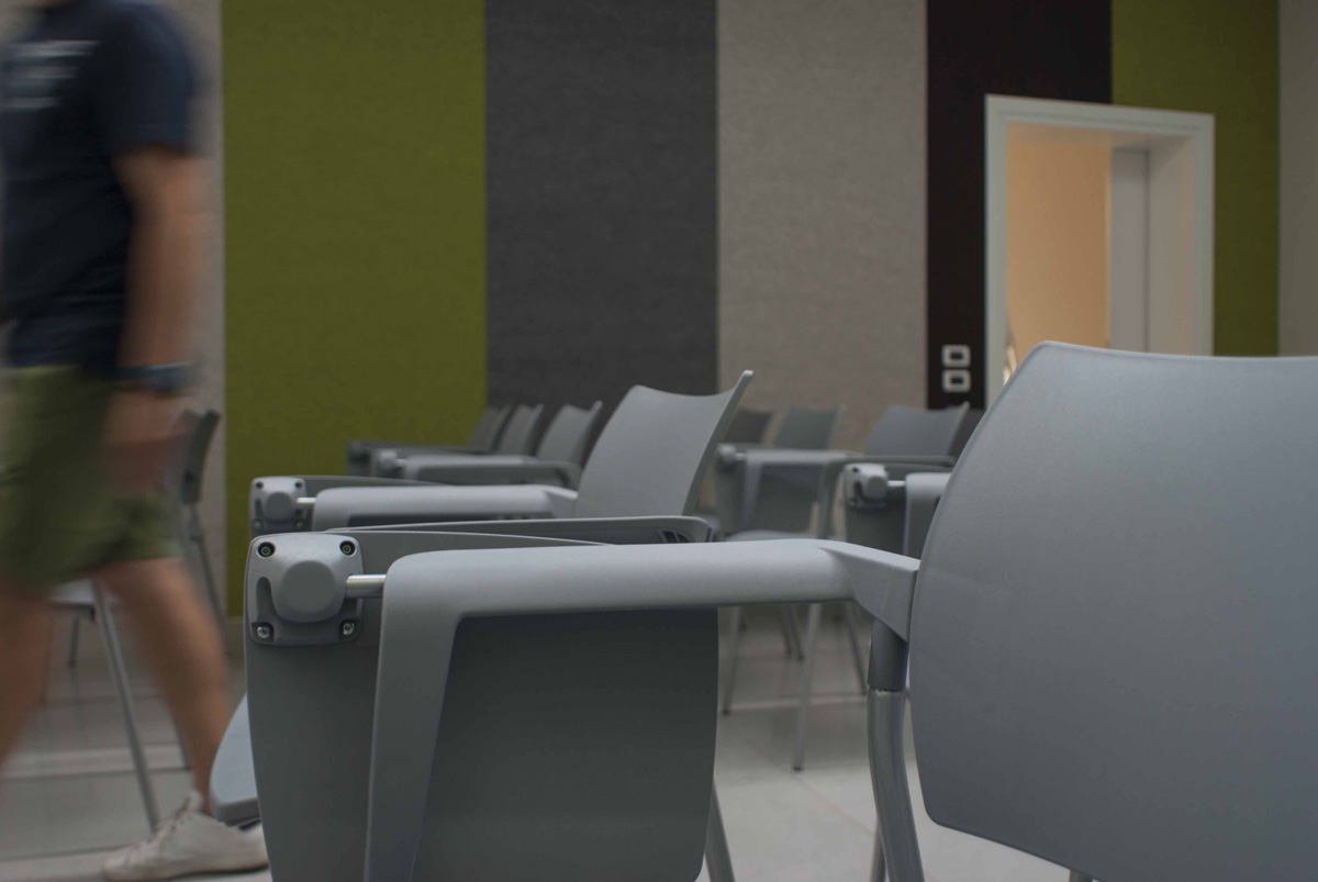 Per questo progetto abbiamo scelto di aprire gli spazi per non nascondere nulla. La resina spatolata a mano fa da base per il bancone reception in frassino naturale, i colori creano nuove gerarchie e segnano le zone di passaggio rendendo l’ingresso accogliente. In linea con la semplicità e il rigore, l’illuminazione della zona d’attesa è generata da linee di luce diffusa, dove la sorgente non è mai in vista, per creare un ambiente caldo e confortevole. La sala conferenze, la sala istituzionale e l’ ingresso secondario mantengono la stessa “filosofia” progettuale creando un continuum che accompagna l’ospite all’interno dell’azienda.